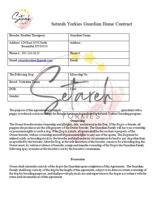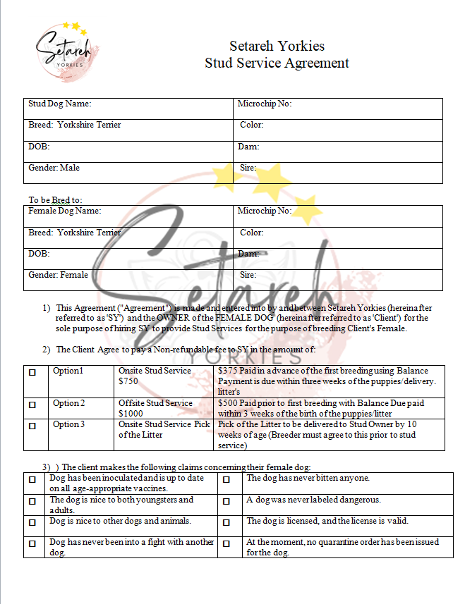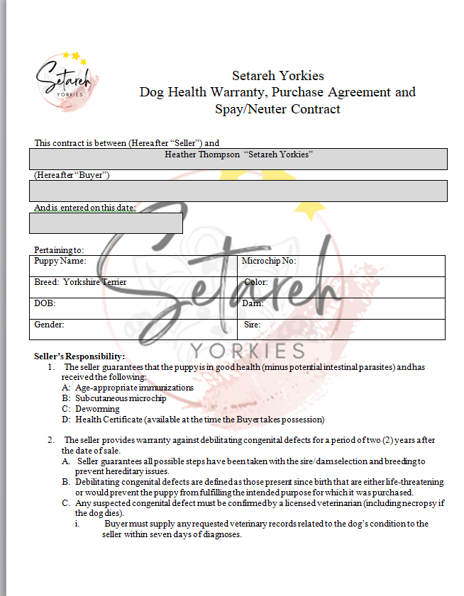 Contracts $20 Each w/your information & logo![]() ![]() ![]() ![]() Puppy Wait List Contract Puppy Sales Contract Puppy Guardian Home Contract Stud Service Contract Please Fill Out This Form to Order: https://form.jotform.com/230138234352043 Then chose from the following payment methods and send payment for the contracts ordered.