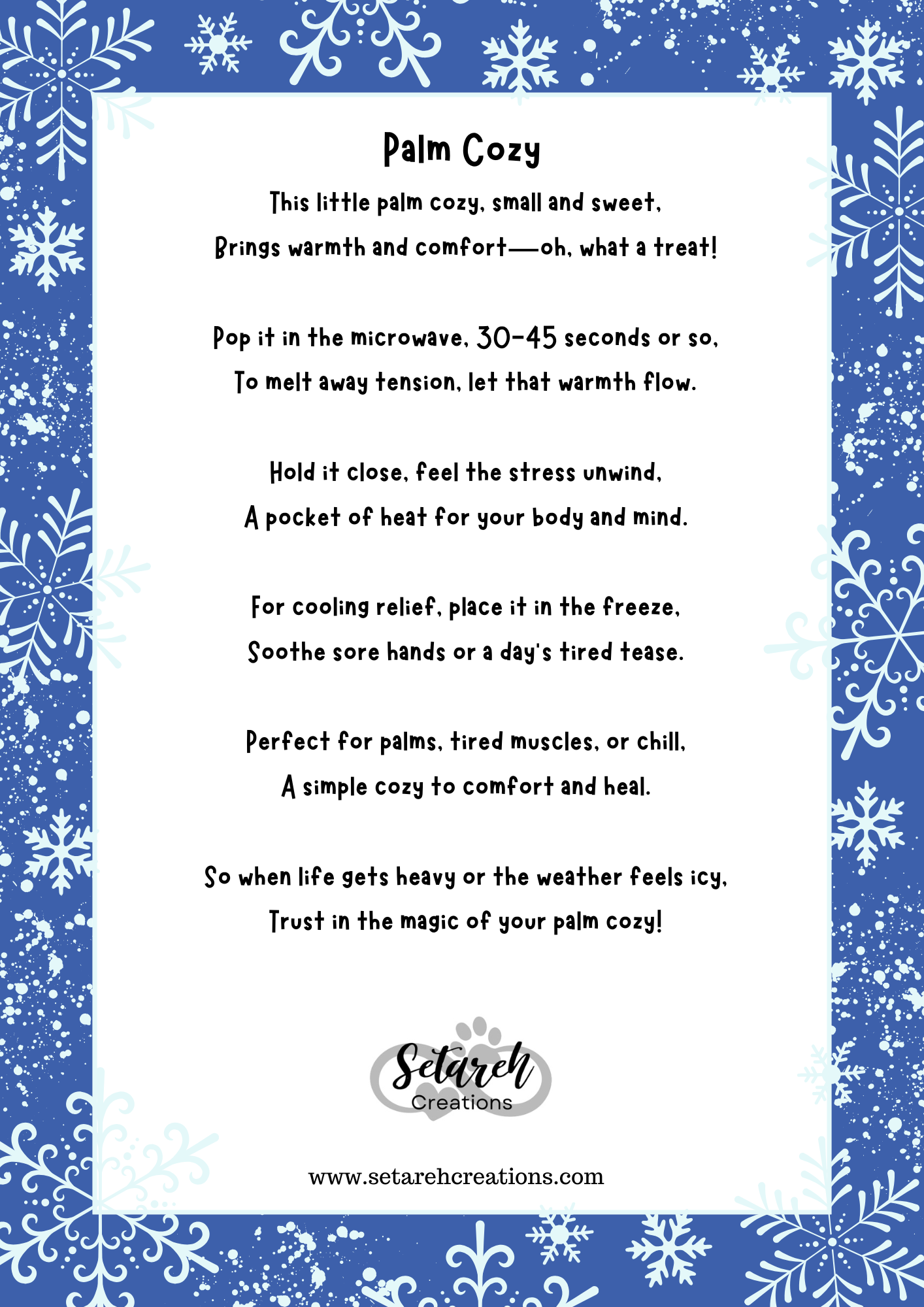 Palm Cozy’s Our Palm Cozy’s are simple, effective, and perfect for keeping your hands warm wherever you go! These pocket-sized rice bags are designed to provide comforting warmth or refreshing coolness in a convenient, compact size. To use for warmth, simply pop them in the microwave for 30-45 seconds (time may vary depending on your microwave) for soothing heat that lasts up to 30-60 minutes. For cold therapy, place them in the freezer overnight to create a quick and easy cold compress. Made with durable, sewn fabric, Palm Cozy’s are easy to use and take with you anywhere. While they don’t currently come with an outer cover, we recommend placing them in a resealable plastic bag to keep them clean during freezer use or to prevent any messes. (Optional outer covers will be available soon—stay tuned!) Please note: Each Palm Cozy is lovingly hand-sewn and may have slight imperfections, making every piece truly one of a kind. Hot Therapy Uses: